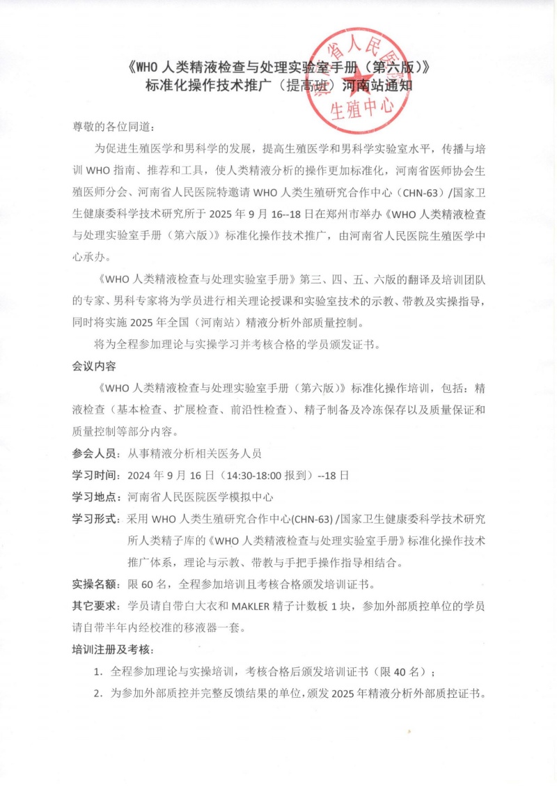 为促进生殖医学和男科学的发展,提高生殖医学和男科学实验室水平,传播与培训 WHO 指南、推荐和工具,使人类精液分析的操作更加标准化,河南省医师协会生殖医师分会、河南省人民医院特邀请WHO人类生殖研究合作中心(CHN-63)/国家卫生健康委科学技术研究所于2025年9月16--18日在郑州市举办《WHO人类精液检查与处理实验室手册(第六版)》标准化操作技术推广,由河南省人民医院生殖医学中心承办。