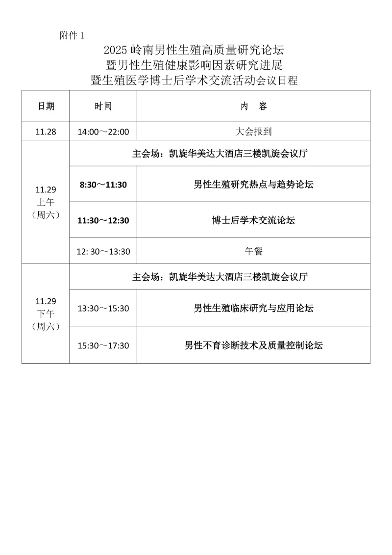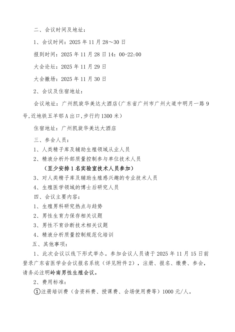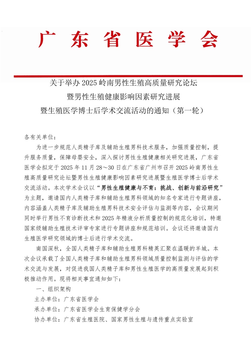 为进一步规范人类精子库及辅助生殖男科技术服务,加强质量控制,提升服务质量,保障母婴安全,深入探讨男性生殖健康相关研究进展,广东省医学会拟定于2025年11月28~30日在广东省广州市召开2025岭南男性生殖高质量研究论坛暨男性生殖健康影响因素研究进展暨生殖医学博士后学术交流活动。本次学术会议以“男性生殖健康与不育:挑战、创新与前沿研究”为主题,邀请国内人类精子库和辅助生殖男科领域的知名专家进行专题讲座,内容涵盖人类精子库及辅助生殖男科技术安全评估与监测等内容,会议期间同时举行男性不育诊断技术和2025年精液分析质量控制的规范化培训,特邀国家级辅助生殖技术评审专家进行专题讲座和规范培训。会议还将邀请国内生殖医学研究领域的博士后进行学术交流。